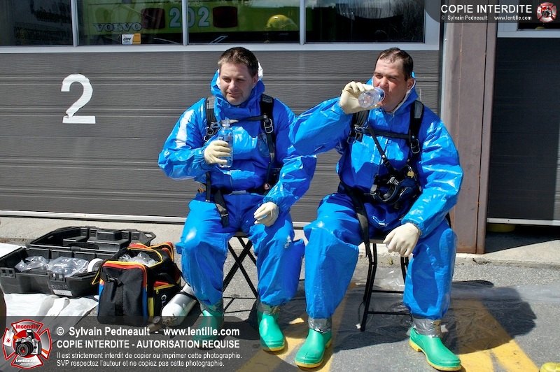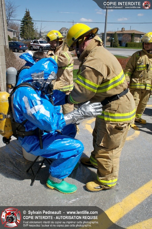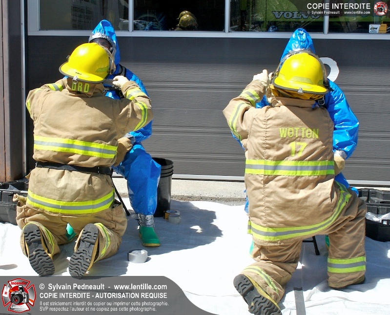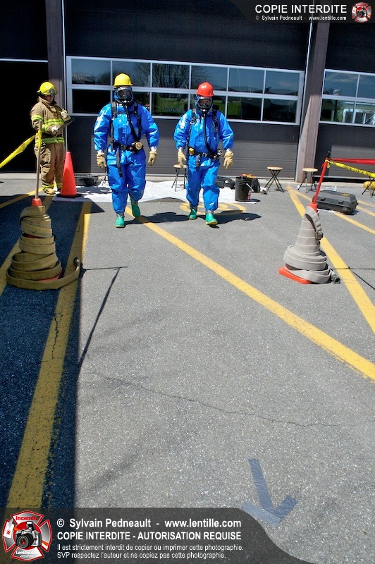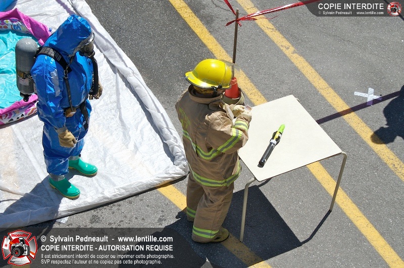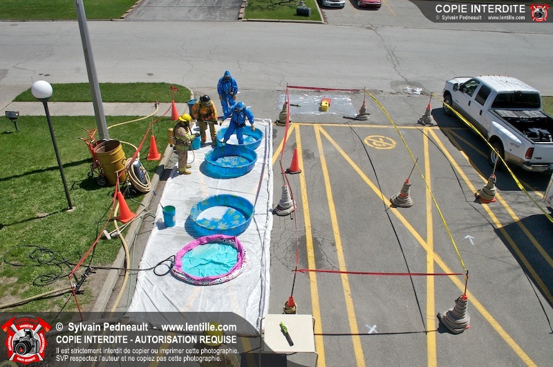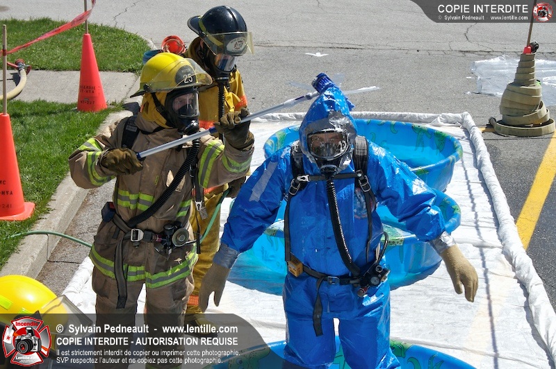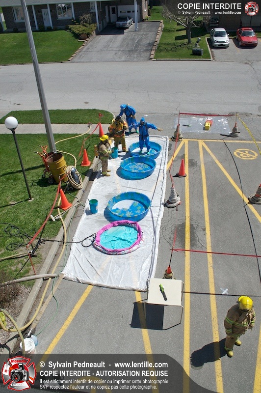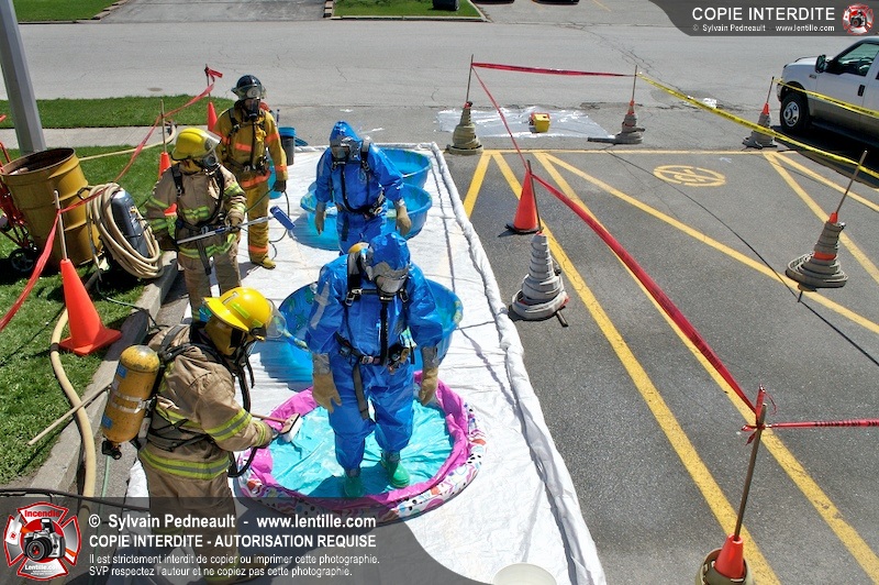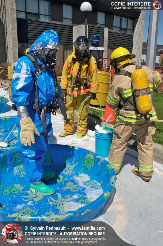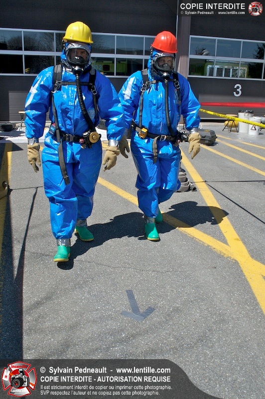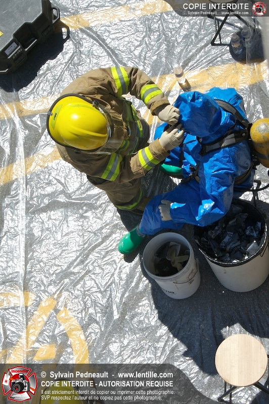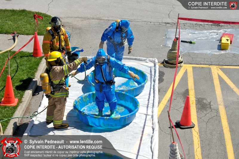 Dans le cadre de la formation du module 22, des pompiers pratiquent les opérations de décontamination.