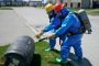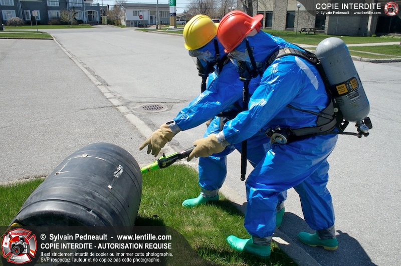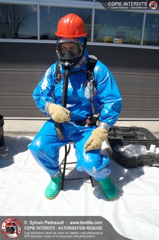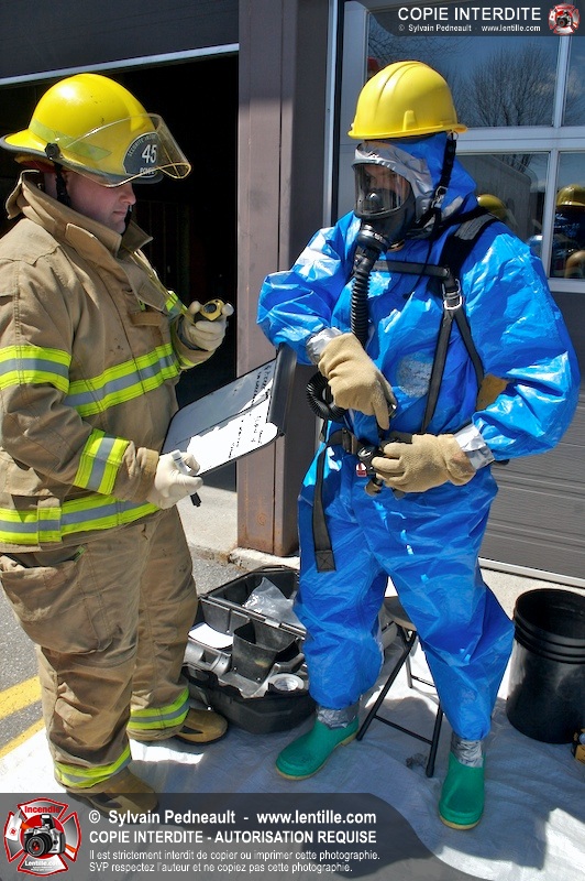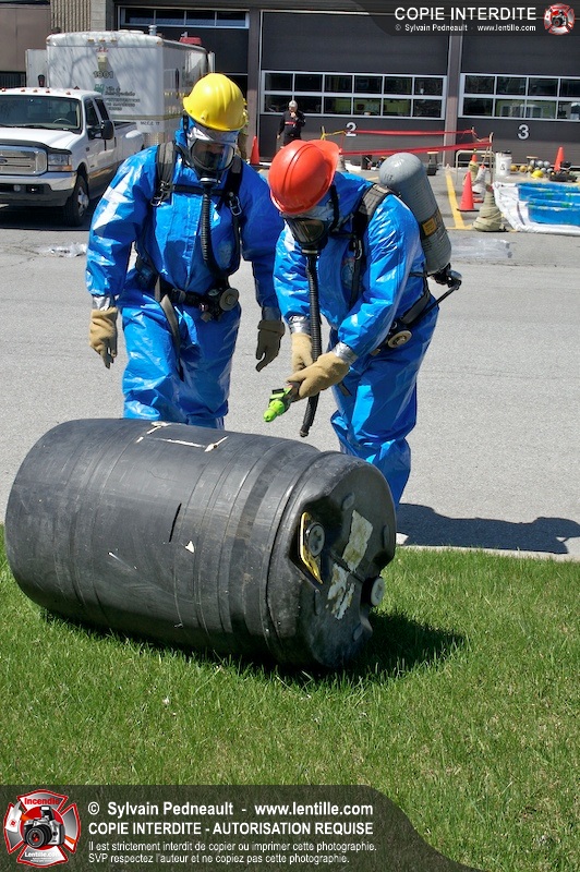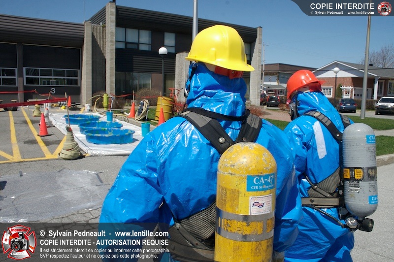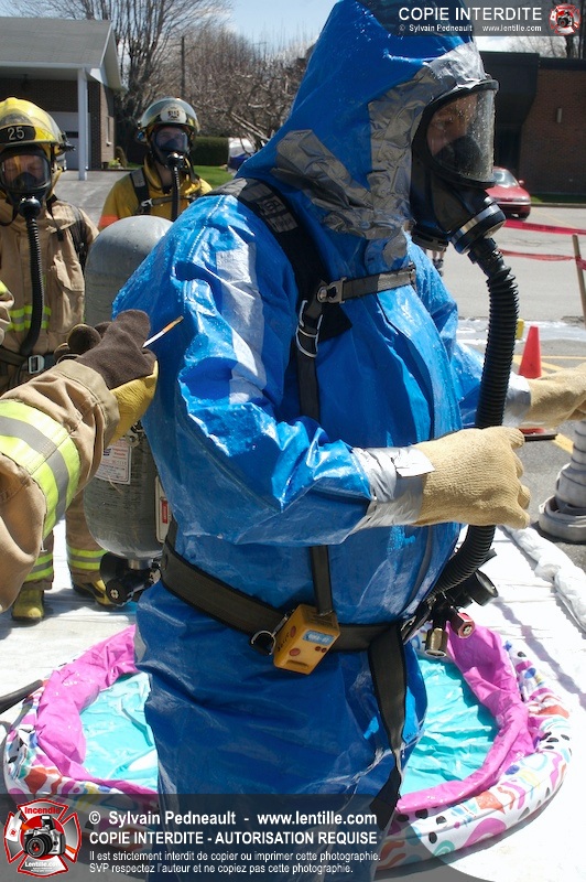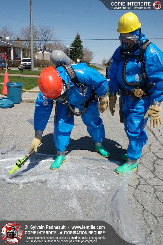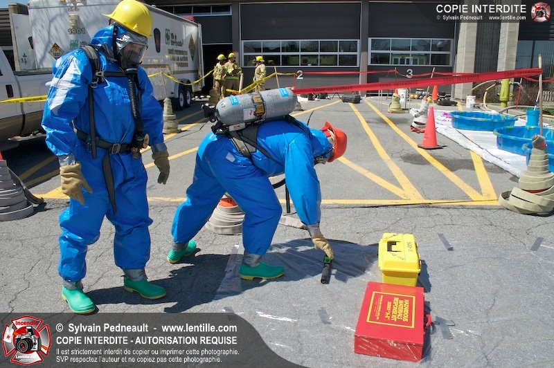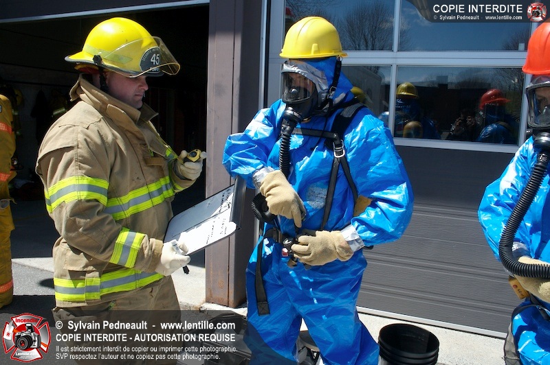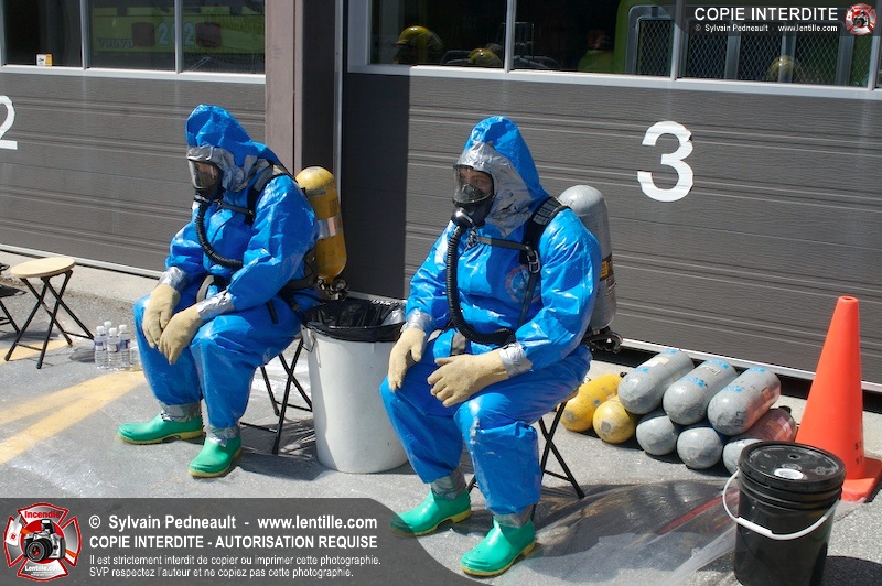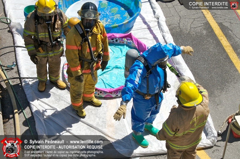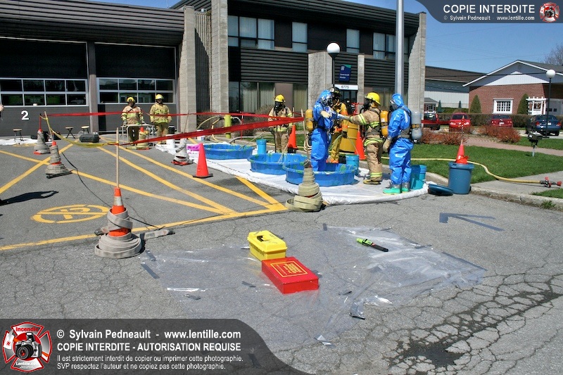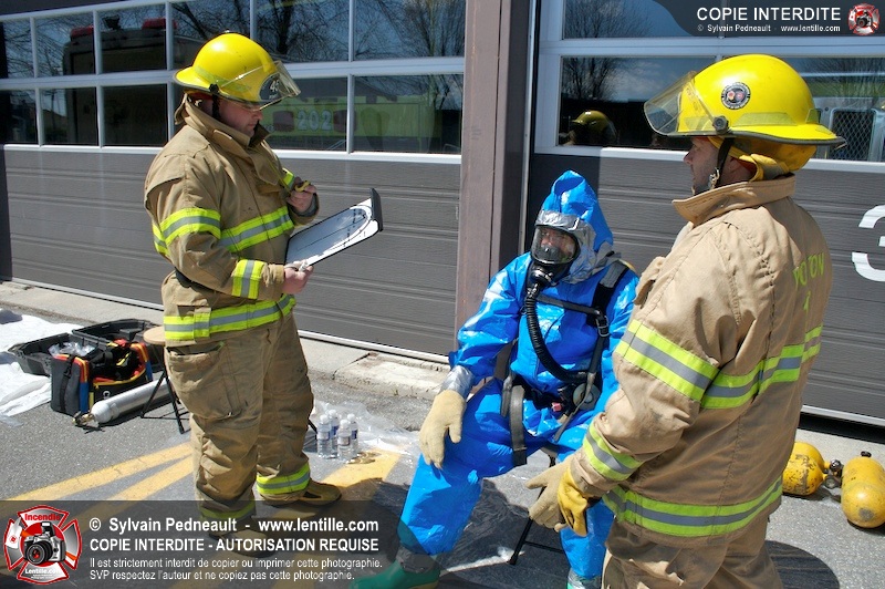 Dans le cadre de la formation du module 22, des pompiers pratiquent les opérations de décontamination.
