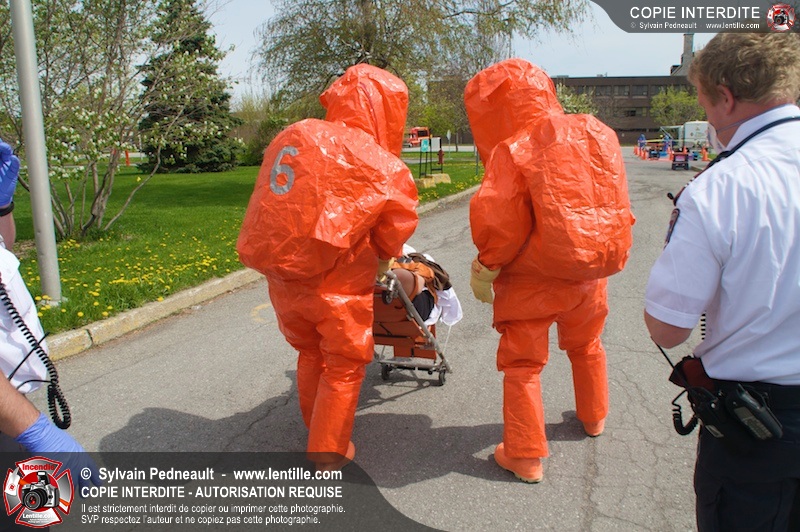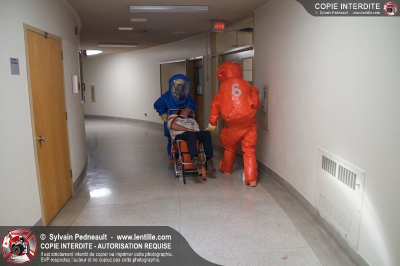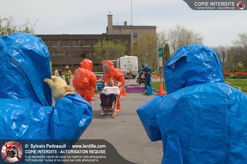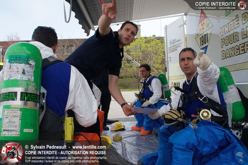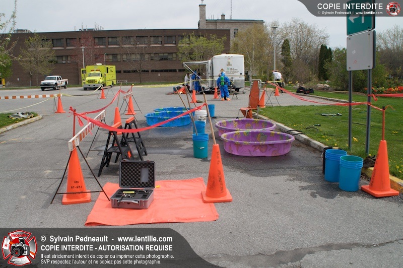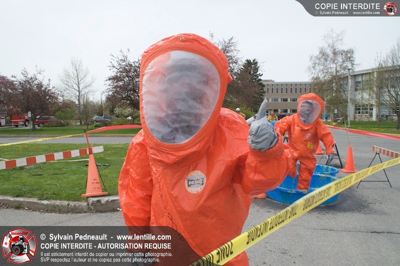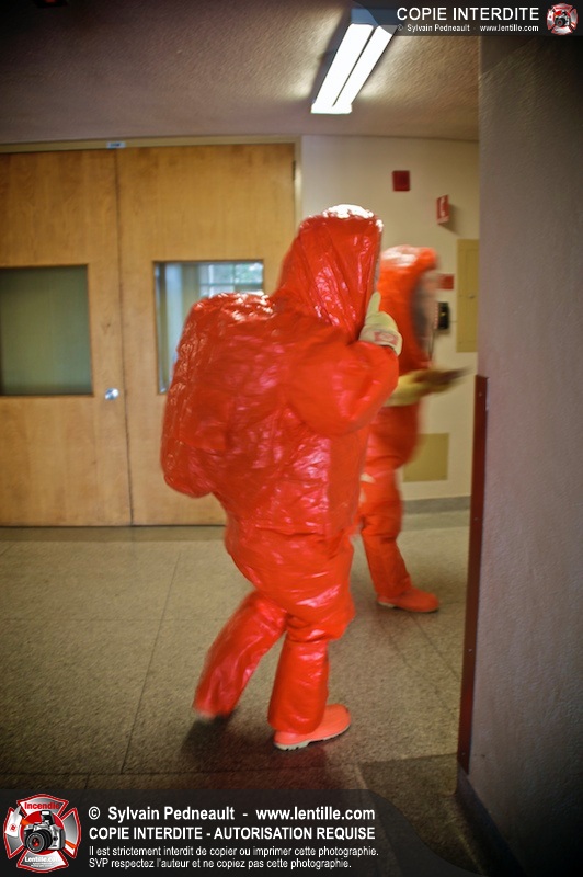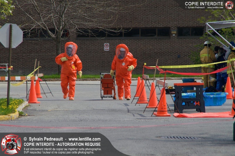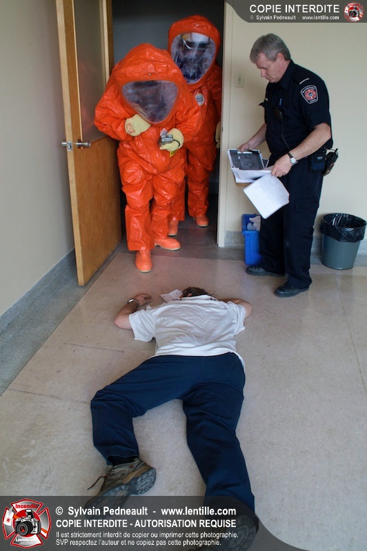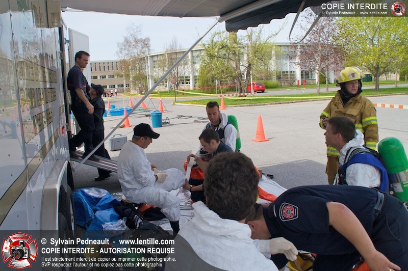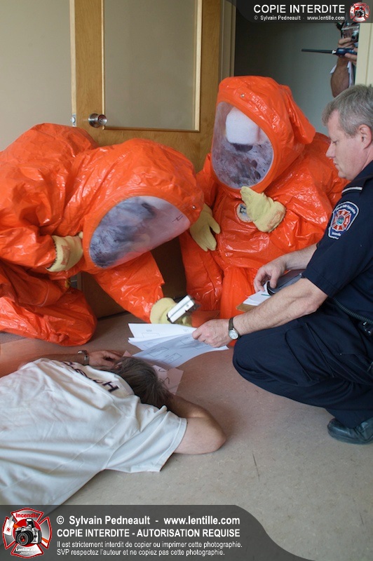 Selon le scénario fictif, un produit X avait été renversé dans un local au deuxième étage d'un bâtiment. Une personne était demeurée dans le local impliqué, alors qu'une autre avait réussi à sortir à l'extérieur. Les paramédics arrivés sur les lieux avaient alors reconnu et déclaré un incident haz-mat, mais devaient rester auprès de la victime à l'extérieur puisqu'ils était déjà contaminés eux-aussi. La première unité incendie arrivée sur les lieux a alors mis en place en périmètre d'exclusion et fait appel à l'unité haz-mat. Cette dernière a mis en place le corridor de décontamination et préparé les intervenants désignés pour aller chercher les victimes.