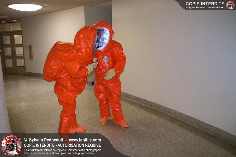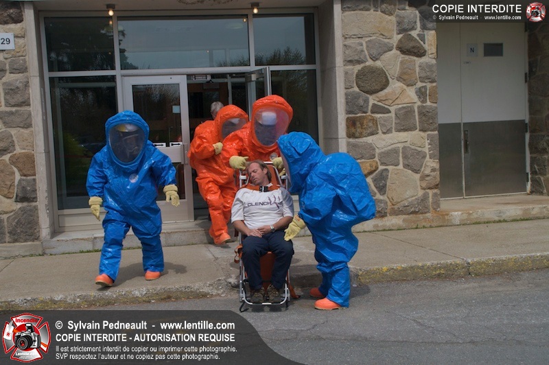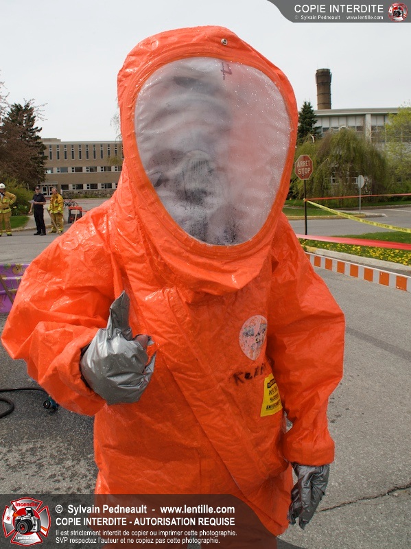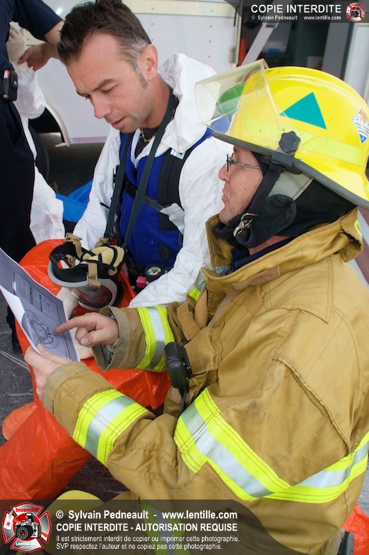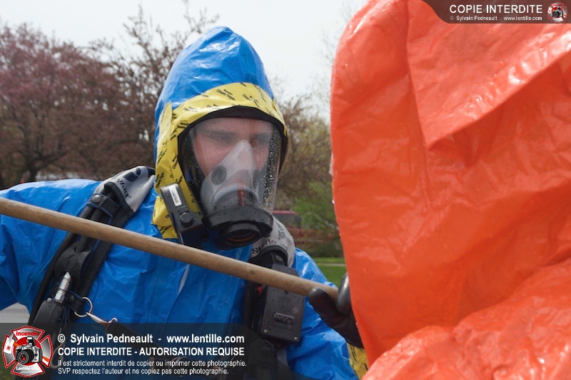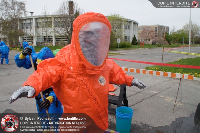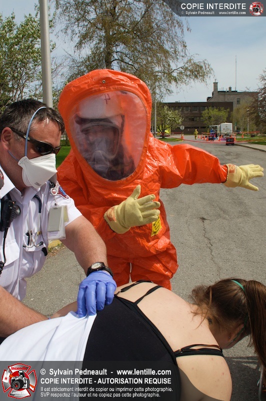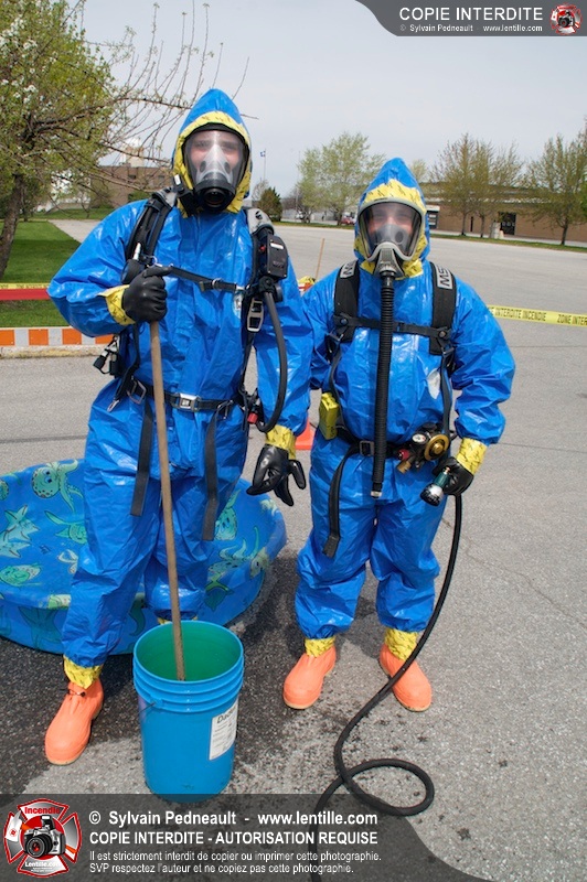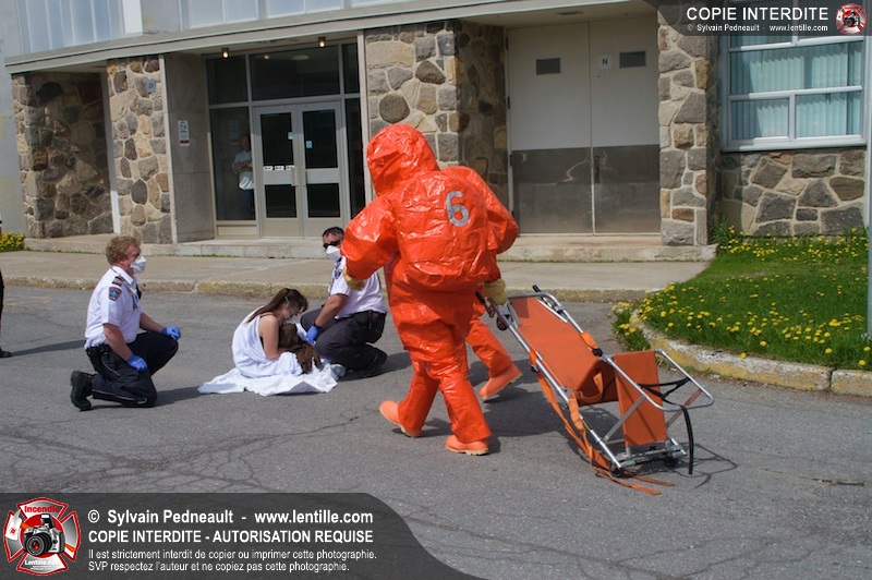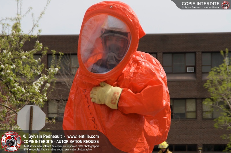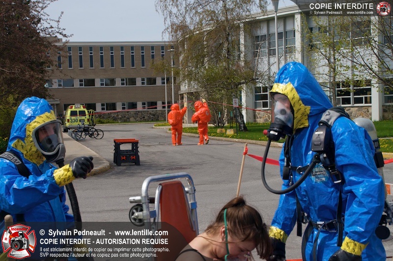 Selon le scénario fictif, un produit X avait été renversé dans un local au deuxième étage d'un bâtiment. Une personne était demeurée dans le local impliqué, alors qu'une autre avait réussi à sortir à l'extérieur. Les paramédics arrivés sur les lieux avaient alors reconnu et déclaré un incident haz-mat, mais devaient rester auprès de la victime à l'extérieur puisqu'ils était déjà contaminés eux-aussi. La première unité incendie arrivée sur les lieux a alors mis en place en périmètre d'exclusion et fait appel à l'unité haz-mat. Cette dernière a mis en place le corridor de décontamination et préparé les intervenants désignés pour aller chercher les victimes.