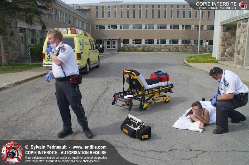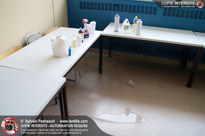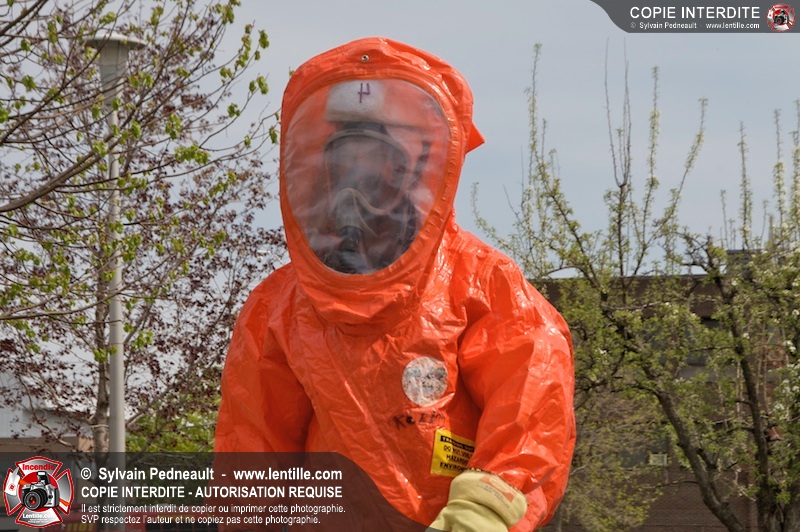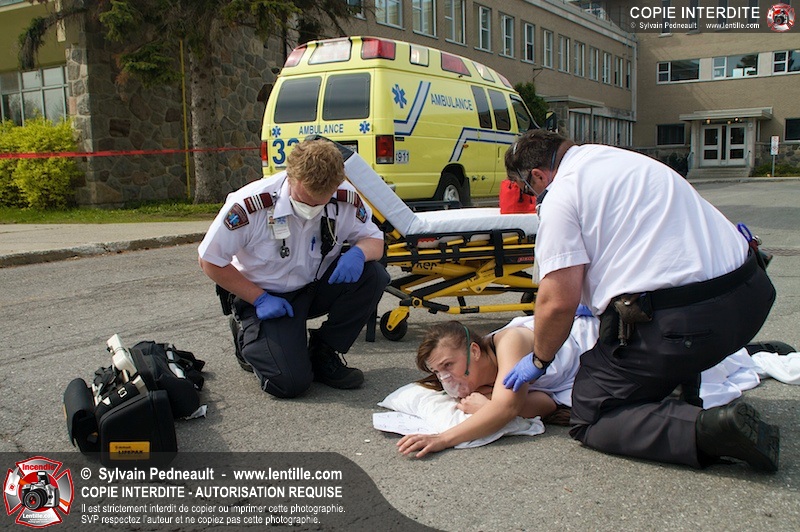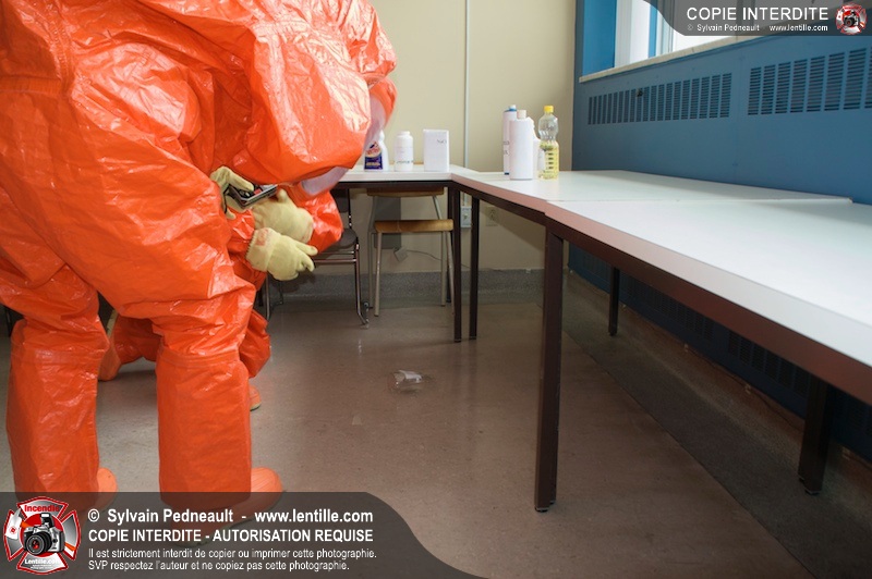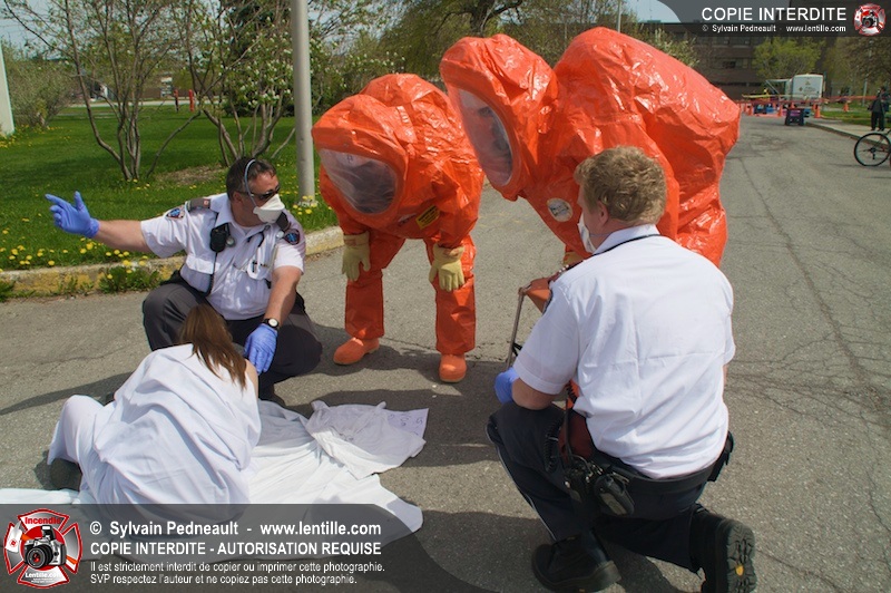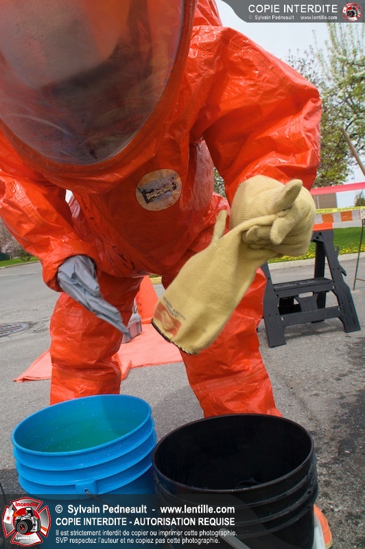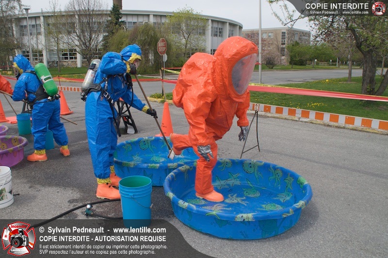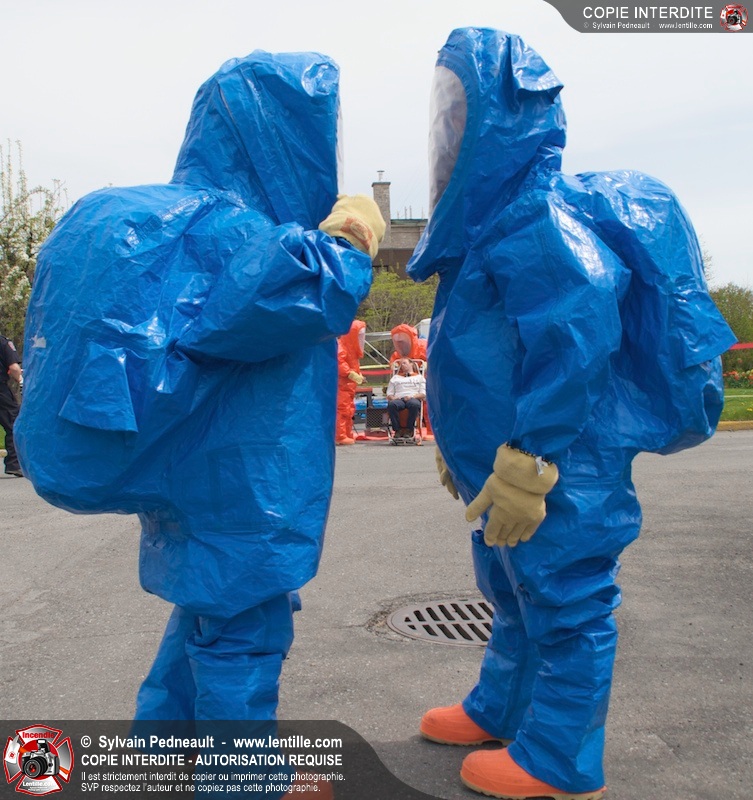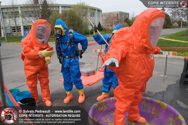 Selon le scénario fictif, un produit X avait été renversé dans un local au deuxième étage d'un bâtiment. Une personne était demeurée dans le local impliqué, alors qu'une autre avait réussi à sortir à l'extérieur. Les paramédics arrivés sur les lieux avaient alors reconnu et déclaré un incident haz-mat, mais devaient rester auprès de la victime à l'extérieur puisqu'ils était déjà contaminés eux-aussi. La première unité incendie arrivée sur les lieux a alors mis en place en périmètre d'exclusion et fait appel à l'unité haz-mat. Cette dernière a mis en place le corridor de décontamination et préparé les intervenants désignés pour aller chercher les victimes.