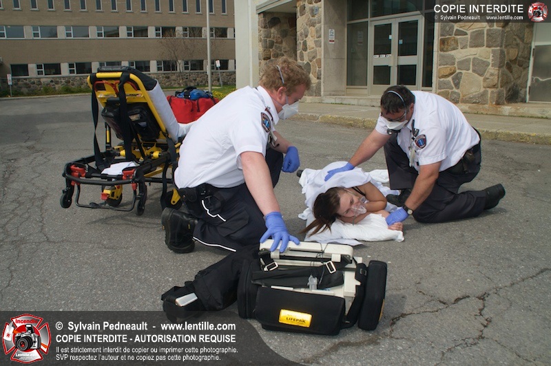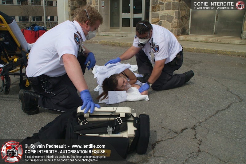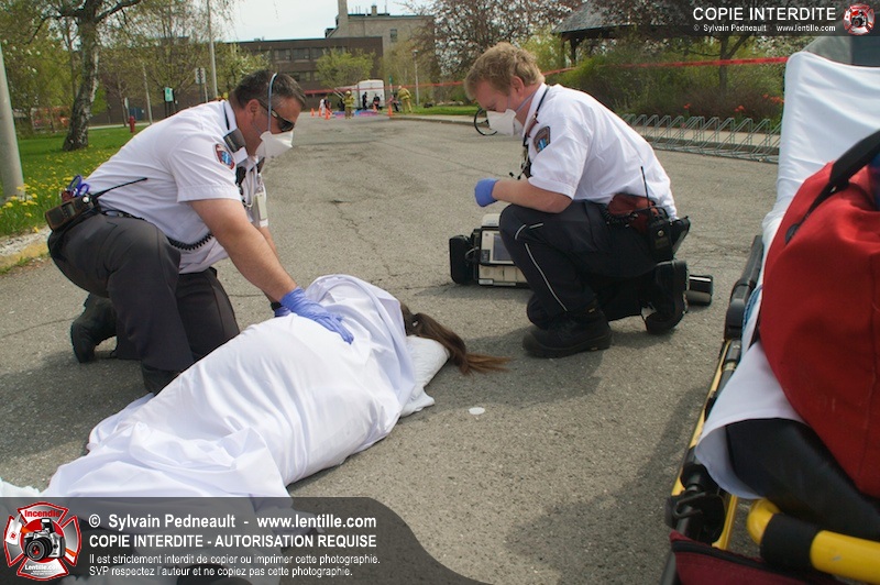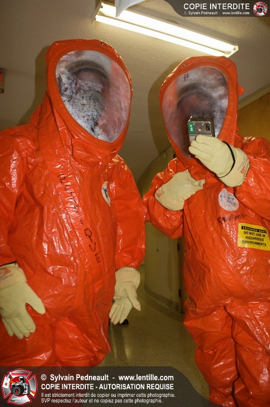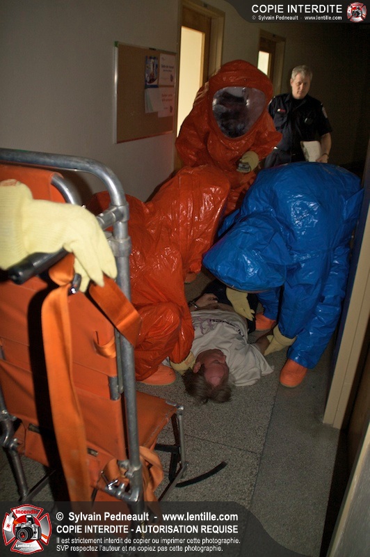 Note: Certaines mesures ont été modifiées/adaptées/contournées pour les besoins de la SIMULATION uniquement (ex: méthode d'immobilisation de la victime normalement inconsciente sur la civière-chaise, méthodes de décontamination, APRIA sous air, etc.), et ne constituent pas nécessairement des pratiques recommandées.